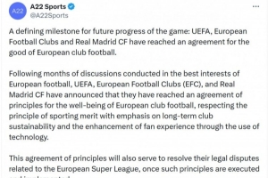 欧超公司:欧足联与皇马的协议是一个里程碑,有助于解决法律纠纷