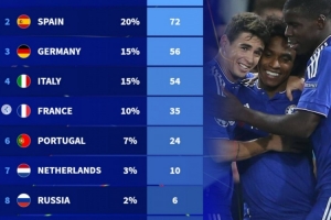 体育资讯2月27日讯 本赛季欧冠淘汰赛抽签在即,德转也盘点了自03/04赛季赛制改革之后,各联赛球队晋级16强次数占比,具体如下(占比+次数):