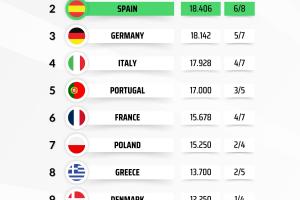 西班牙排名第二,只领先德国0.264分。