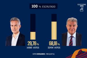 巴萨俱乐部主席选举结束,拉波尔塔成功当选。他获得了32934张票,得票率68.18%。《世界体育报》指出,在巴萨俱乐部历史上的所有主席选举中,得票数比拉波尔塔更高的只有2010年的罗塞尔,当时他获得了35021张票。而得票率比拉波尔塔更高的只有1997年的努涅斯,当时他的得票率是76.31%。