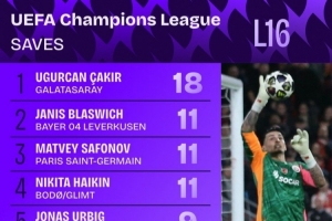 据Squawka统计,加拉塔萨雷门将恰基尔对阵利物浦两回合做出18次扑救,包括扑出萨拉赫的点球,本届1/8决赛扑救次数最多。恰基尔次回合比赛做出11次扑救,近10个赛季欧冠淘汰赛单场扑救次数最多。